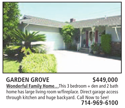GARDEN GROVE $449,000 Wonderful Family Home…This 3 bedroom + den and 2 bath home has large living room w/fireplace. Direct garage access through kitchen and huge backyard. Call Now to See!