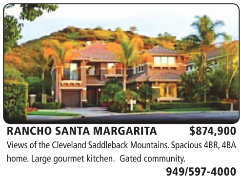 RANCHO SANTA MARGARITA $874,900 Views of the Cleveland Saddleback Mountains. Spacious 4BR, 4BA home. Large gourmet kitchen. Gated community.