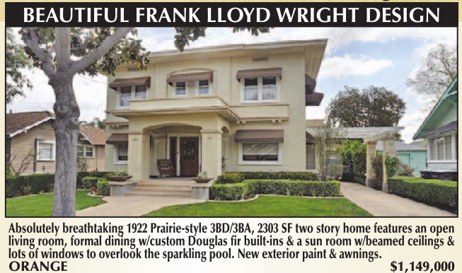 BEAUTIFUL FRANK LLOYD WRIGHT DESIGN Absolutely breathtaking 1922 Prairie-style 3BD/3BA, 2303 SF two story home features an open living room, formal dining w/custom Douglas fir built-ins & a sun room w/beamed ceilings & lots of windows to overlook the sparkling pool. New exterior paint & awnings. ORANGE $1,149,000