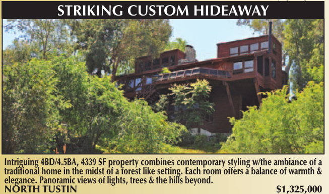 ROSSMOOR $1,250,000 STRIKING CUSTOM HIDEAWAY Intriguing 4BD/4.5BA, 4339 SF property combines contemporary styling w/the ambiance of a traditional home in the midst of a forest like setting. Each room offers a balance of warmth & elegance. Panoramic views of lights, trees & the hills beyond. NORTH TUSTIN $1,325,000