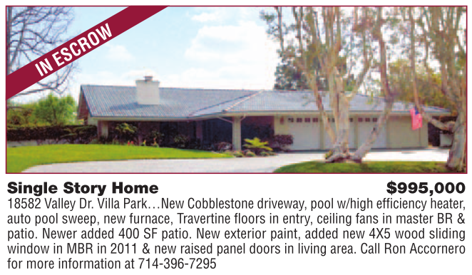 Single Story Home $995,000 18582 Valley Dr. Villa Park…New Cobblestone driveway, pool w/high effi ciency heater, auto pool sweep, new furnace, Travertine fl oors in entry, ceiling fans in master BR & patio. Newer added 400 SF patio. New exterior paint, added new 4X5 wood sliding window in MBR in 2011 & new raised panel doors in living area. Call Ron Accornero for more information at 714-396-7295