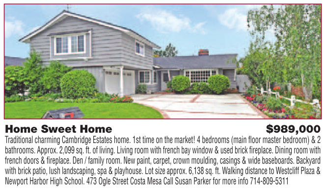 Home Sweet Home $989,000 Traditional charming Cambridge Estates home. 1st time on the market! 4 bedrooms (main fl oor master bedroom) & 2 bathrooms. Approx. 2,099 sq. ft. of living. Living room with french bay window & used brick fireplace. Dining room with french doors & fireplace. Den / family room. New paint, carpet, crown moulding, casings & wide baseboards. Backyard with brick patio, lush landscaping, spa & playhouse. Lot size approx. 6,138 sq. ft. Walking distance to Westcliff Plaza & Newport Harbor High School. 473 Ogle Street Costa Mesa Call Susan Parker for more info 714-809-5311