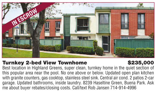 Turnkey 2-bed View Townhome $235,000 Best location in Highland Greens, super clean, turnkey home in the quiet section of this popular area near the pool. No one above or below. Updated open plan kitchen with granite counters, gas cooktop, stainless steel sink. Central air cond. 2 patios 2-car garage. Updated bathrooms, inside laundry. 8239 Haseltine Green, Buena Park. Ask me about buyer rebates/closing costs. Call/text Rob Jansen 714-914-4996