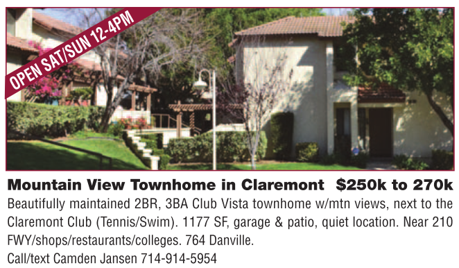 Mountain View Townhome in Claremont $250k to 270k Beautifully maintained 2BR, 3BA Club Vista townhome w/mtn views, next to the Claremont Club (Tennis/Swim). 1177 SF, garage & patio, quiet location. Near 210 FWY/shops/restaurants/colleges. 764 Danville. Call/text Camden Jansen 714-914-5954