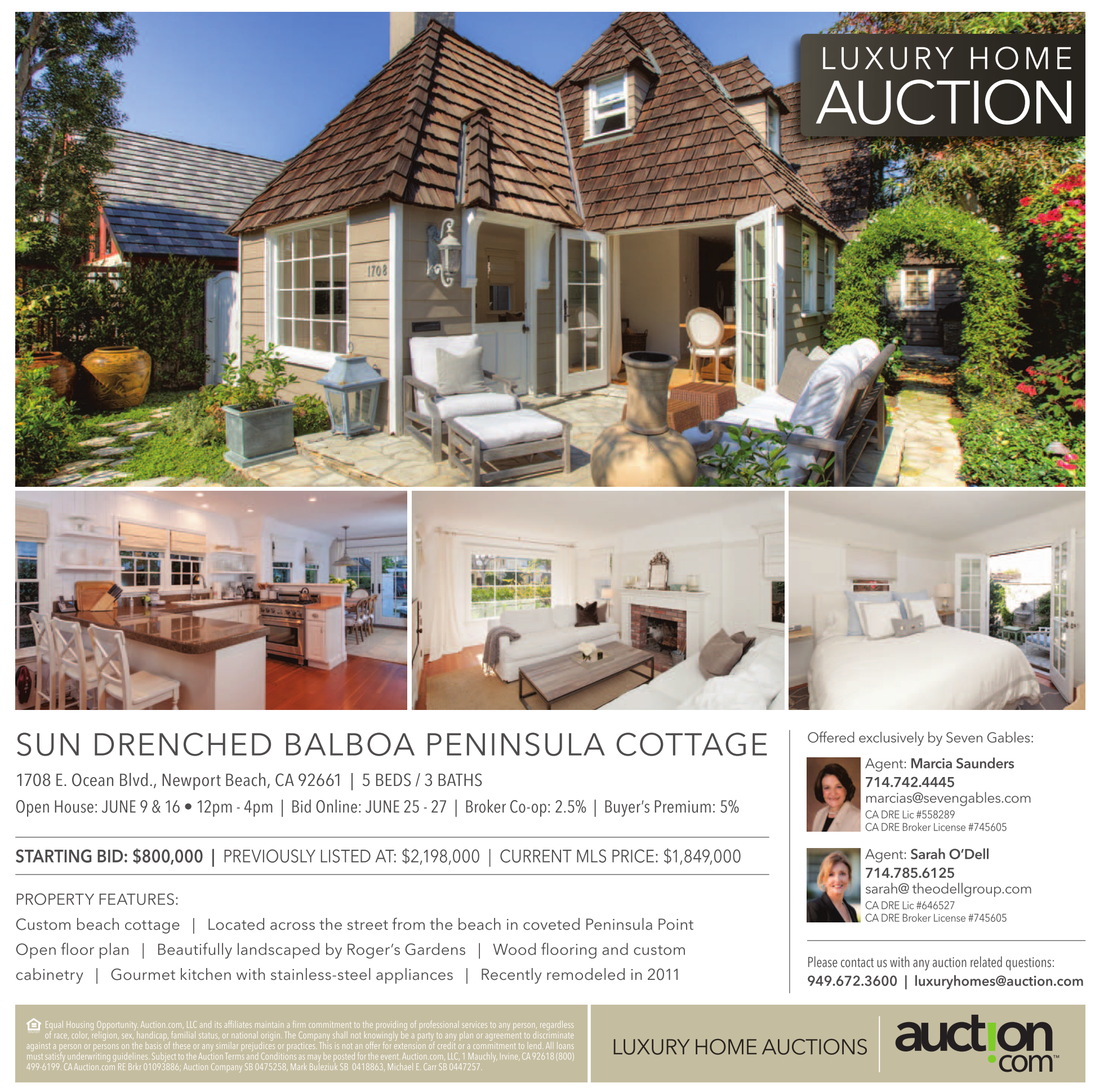 1708 E. Ocean Blvd., Newport Beach, CA 92661 | 5 BEDS / 3 BATHS Open House: JUNE 9 & 16 • 12pm - 4pm | Bid Online: JUNE 25 - 27 | Broker Co-op: 2.5% | Buyer’s Premium: 5%