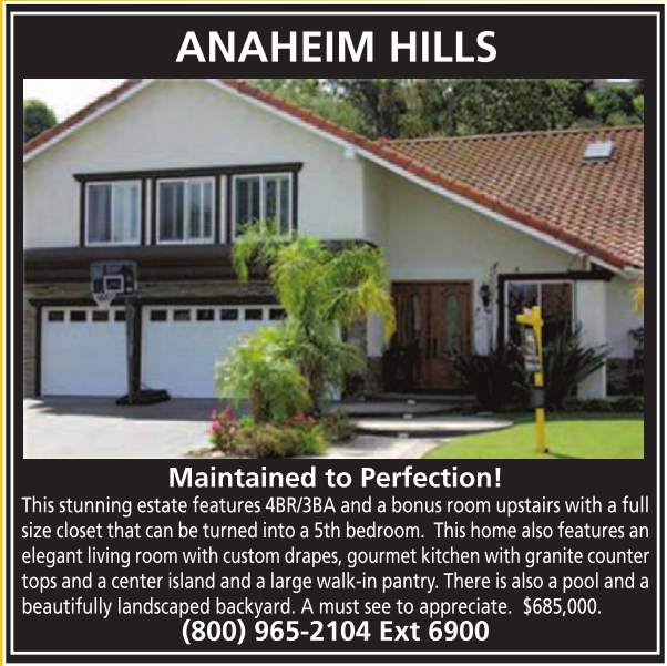 ANAHEIM HILLS Maintained to Perfection! This stunning estate features 4BR/3BA and a bonus room upstairs with a full size closet that can be turned into a 5th bedroom. This home also features an elegant living room with custom drapes, gourmet kitchen with granite counter tops and a center island and a large walk-in pantry. There is also a pool and a beautifully landscaped backyard. A must see to appreciate. $685,000. (800) 965-2104 Ext 6900