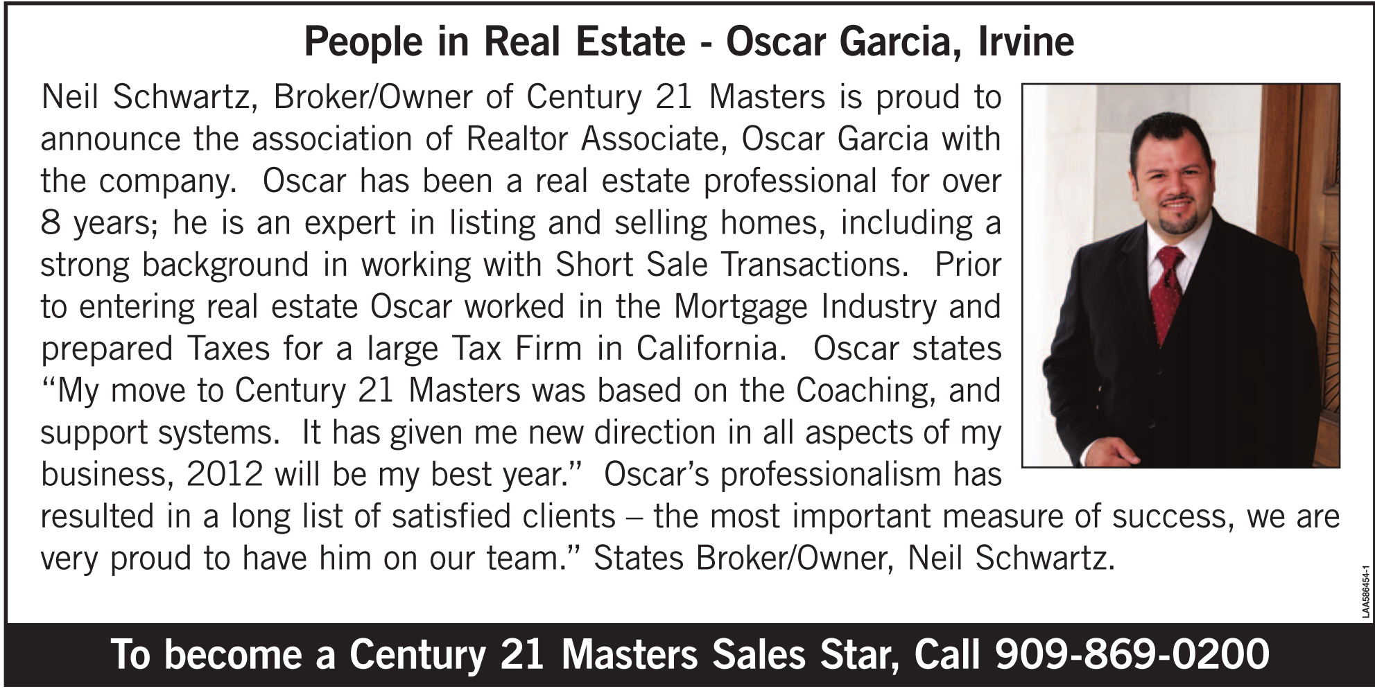 People in Real Estate - Oscar Garcia, Irvine Neil Schwartz, Broker/Owner of Century 21 Masters is proud to announce the association of Realtor Associate, Oscar Garcia with the company. Oscar has been a real estate professional for over 8 years; he is an expert in listing and selling homes, including a strong background in working with Short Sale Transactions. Prior to entering real estate Oscar worked in the Mortgage Industry and prepared Taxes for a large Tax Firm in California. Oscar states “My move to Century 21 Masters was based on the Coaching, and support systems. It has given me new direction in all aspects of my business, 2012 will be my best year.” Oscar’s professionalism has resulted in a long list of satisfied clients – the most important measure of success, we are very proud to have him on our team.” States Broker/Owner, Neil Schwartz. To become a Century 21 Masters Sales Star, Call 909-869-0200