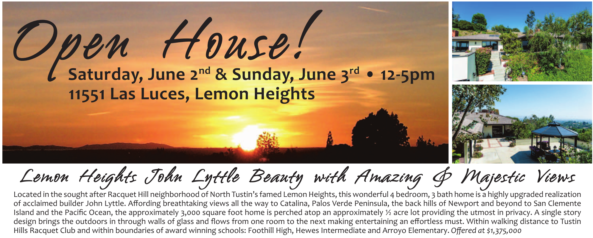 O p e n H o u s e ! Saturday, June 2 nd & Sunday, June 3 rd • 12-5pm 11551 Las Luces, Lemon Heights Lemon Heights John Lyttle Beauty with Amazing & Majestic Views Located in the sought after Racquet Hill neighborhood of North Tustin’s famed Lemon Heights, this wonderful 4 bedroom, 3 bath home is a highly upgraded realization of acclaimed builder John Lyttle. Affording breathtaking views all the way to Catalina, Palos Verde Peninsula, the back hills of Newport and beyond to San Clemente Island and the Pacific Ocean, the approximately 3,000 square foot home is perched atop an approximately ½ acre lot providing the utmost in privacy. A single story design brings the outdoors in through walls of glass and flows from one room to the next making entertaining an effortless must. Within walking distance to Tustin Hills Racquet Club and within boundaries of award winning schools: Foothill High, Hewes Intermediate and Arroyo Elementary. Offered at $1,375,000