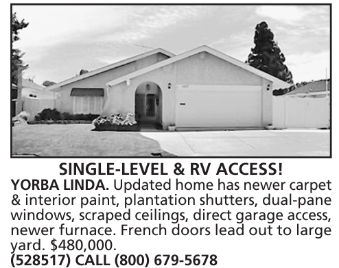SINGLE-LEVEL & RV ACCESS! YORBA LINDA. Updated home has newer carpet & interior paint, plantation shutters, dual-pane windows, scraped ceilings, direct garage access, newer furnace. French doors lead out to large yard. $480,000. (528517) CALL (800) 679-5678