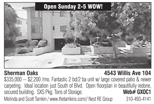 Open Sunday 2-5 WOW! Sherman Oaks 4543 Willis Ave 104 $335,000 -- $2,200 /mo. Fantastic 2 bd/2 ba unit w/ large covered patio & newer carpeting. Ideal location just South of Blvd. Open floorplan in beautifully redone, secured building. SXS Pkg. Tons of Storage. Web# GXOC1 Melinda and Scott Tamkin / www.thetamkins.com// Nest RE Group 310-493-4141