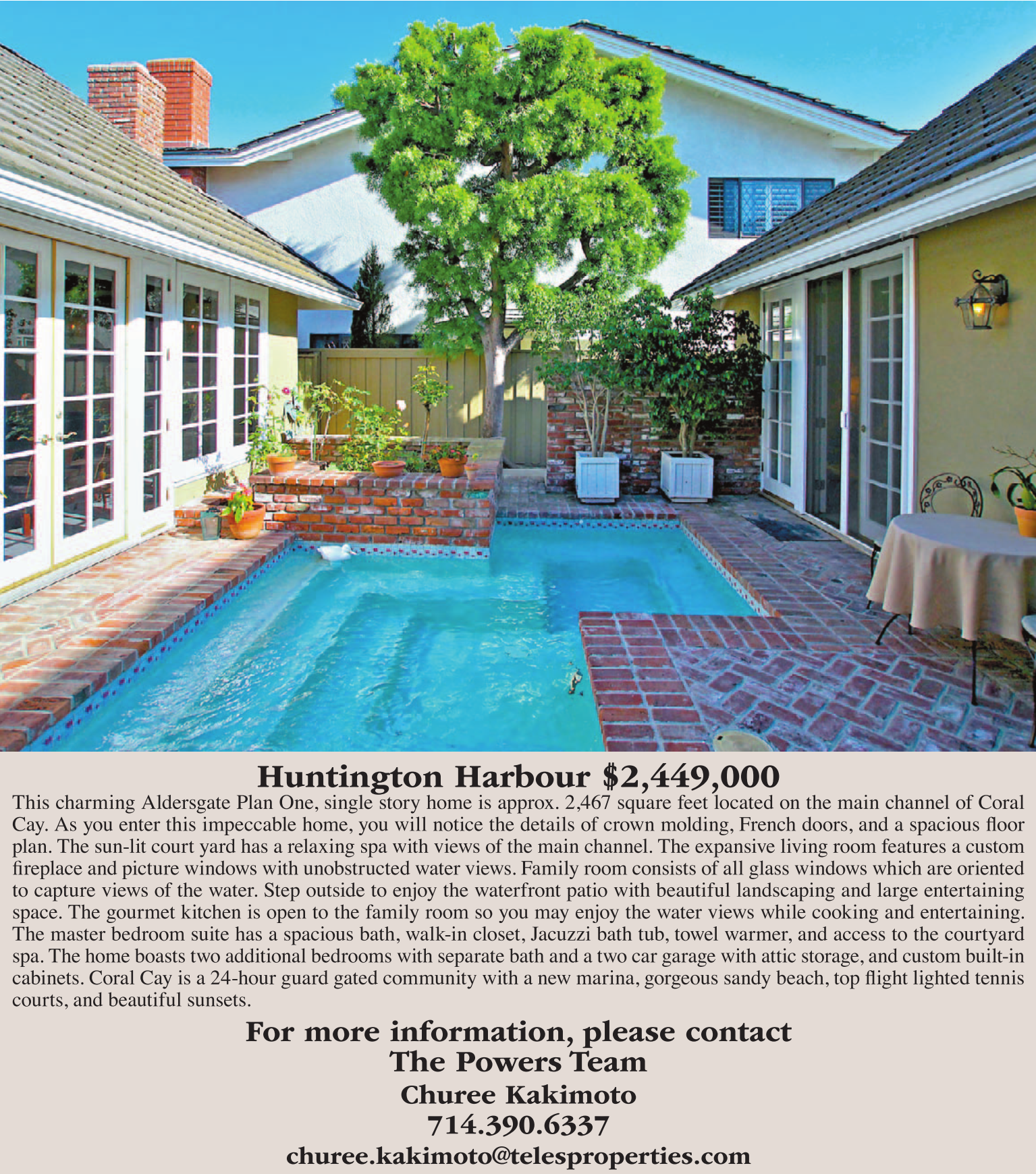 Huntington Harbour $2,449,000 This charming Aldersgate Plan One, single story home is approx. 2,467 square feet located on the main channel of Coral Cay. As you enter this impeccable home, you will notice the details of crown molding, French doors, and a spacious floor plan. The sun-lit court yard has a relaxing spa with views of the main channel. The expansive living room features a custom fireplace and picture windows with unobstructed water views. Family room consists of all glass windows which are oriented to capture views of the water. Step outside to enjoy the waterfront patio with beautiful landscaping and large entertaining space. The gourmet kitchen is open to the family room so you may enjoy the water views while cooking and entertaining. The master bedroom suite has a spacious bath, walk-in closet, Jacuzzi bath tub, towel warmer, and access to the courtyard spa. The home boasts two additional bedrooms with separate bath and a two car garage with attic storage, and custom built-in cabinets. Coral Cay is a 24-hour guard gated community with a new marina, gorgeous sandy beach, top flight lighted tennis courts, and beautiful sunsets. For more information, please contact The Powers Team Churee Kakimoto 714.390.6337 churee.kakimoto@telesproperties.com