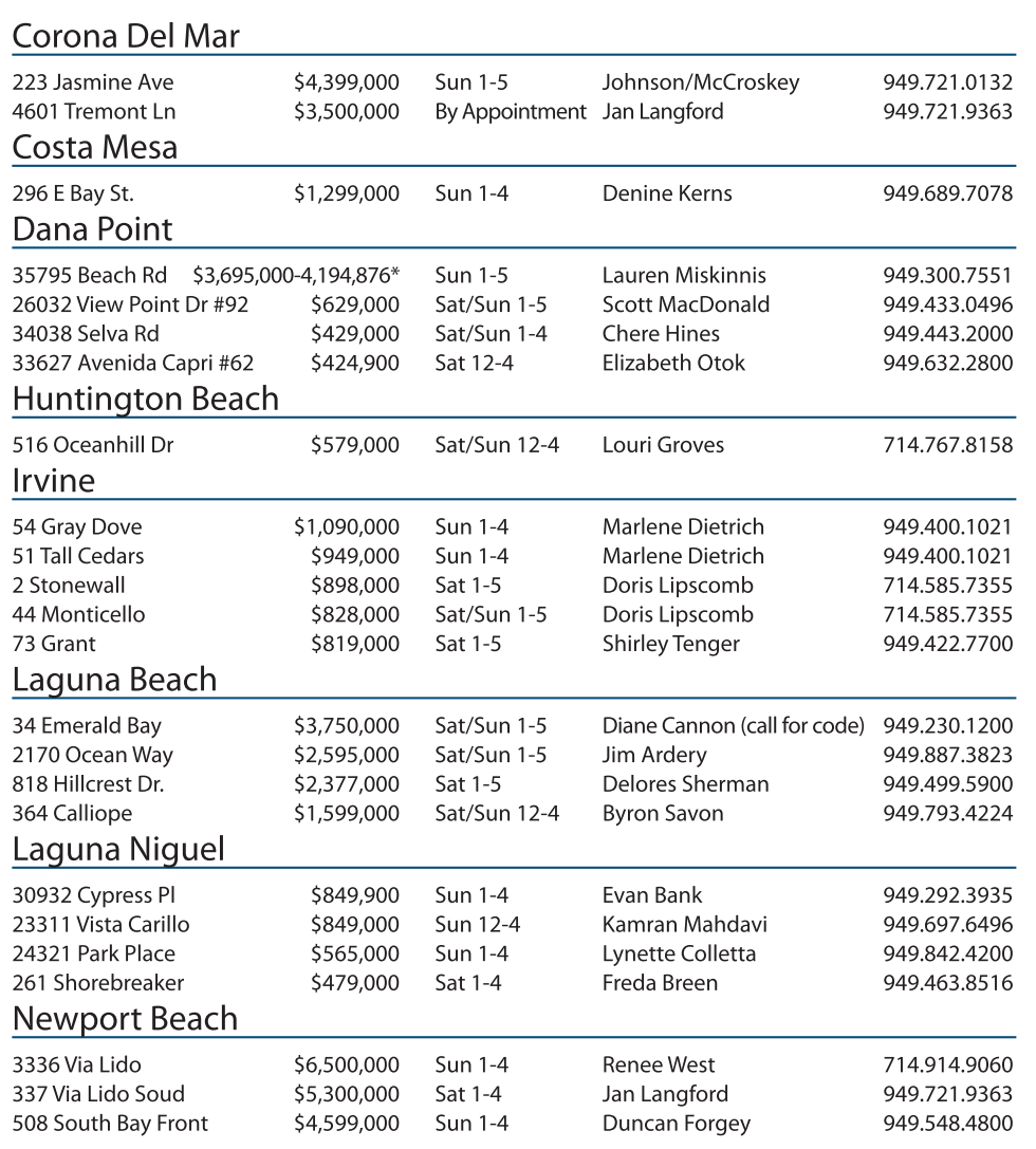 4601 Tremont Ln $3,500,000 By Appointment Jan Langford 949.721.9363 Costa Mesa 296 E Bay St. $1,299,000 Sun 1-4 Denine Kerns 949.689.7078 Dana Point 35795 Beach Rd $3,695,000-4,194,876* Sun 1-5 Lauren Miskinnis 949.300.7551 26032 View Point Dr #92 $629,000 Sat/Sun 1-5 Scott MacDonald 949.433.0496 34038 Selva Rd $429,000 Sat/Sun 1-4 Chere Hines 949.443.2000 33627 Avenida Capri #62 $424,900 Sat 12-4 Elizabeth Otok 949.632.2800 Huntington Beach 516 Oceanhill Dr $579,000 Sat/Sun 12-4 Louri Groves 714.767.8158 Irvine 54 Gray Dove $1,090,000 Sun 1-4 Marlene Dietrich 949.400.1021 51 Tall Cedars $949,000 Sun 1-4 Marlene Dietrich 949.400.1021 2 Stonewall $898,000 Sat 1-5 Doris Lipscomb 714.585.7355 44 Monticello $828,000 Sat/Sun 1-5 Doris Lipscomb 714.585.7355 73 Grant $819,000 Sat 1-5 Shirley Tenger 949.422.7700 Laguna Beach 34 Emerald Bay $3,750,000 Sat/Sun 1-5 Diane Cannon (call for code) 949.230.1200 2170 Ocean Way $2,595,000 Sat/Sun 1-5 Jim Ardery 949.887.3823 818 Hillcrest Dr. $2,377,000 Sat 1-5 Delores Sherman 949.499.5900 364 Calliope $1,599,000 Sat/Sun 12-4 Byron Savon 949.793.4224 Laguna Niguel 30932 Cypress Pl $849,900 Sun 1-4 Evan Bank 949.292.3935 23311 Vista Carillo $849,000 Sun 12-4 Kamran Mahdavi 949.697.6496 24321 Park Place $565,000 Sun 1-4 Lynette Colletta 949.842.4200 261 Shorebreaker $479,000 Sat 1-4 Freda Breen 949.463.8516 Newport Beach 3336 Via Lido $6,500,000 Sun 1-4 Renee West 714.914.9060 337 Via Lido Soud $5,300,000 Sat 1-4 Jan Langford 949.721.9363 508 South Bay Front $4,599,000 Sun 1-4 Duncan Forgey 949.548.4800