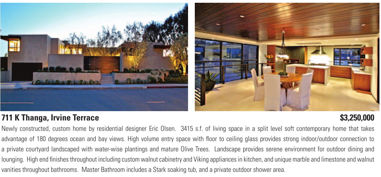 711 K Thanga, Irvine Terrace $3,250,000 Newly constructed, custom home by residential designer Eric Olsen. 3415 s.f. of living space in a split level soft contemporary home that takes advantage of 180 degrees ocean and bay views. High volume entry space with floor to ceiling glass provides strong indoor/outdoor connection to a private courtyard landscaped with water-wise plantings and mature Olive Trees. Landscape provides serene environment for outdoor dining and lounging. High end finishes throughout including custom walnut cabinetry and Viking appliances in kitchen, and unique marble and limestone and walnut vanities throughout bathrooms. Master Bathroom includes a Stark soaking tub, and a private outdoor shower area.