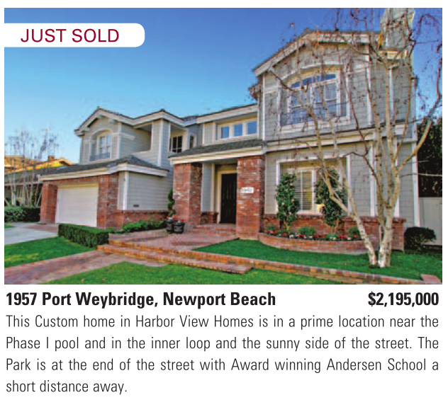 1957 Port Weybridge, Newport Beach $2,195,000 This Custom home in Harbor View Homes is in a prime location near the Phase I pool and in the inner loop and the sunny side of the street. The Park is at the end of the street with Award winning Andersen School a short distance away.