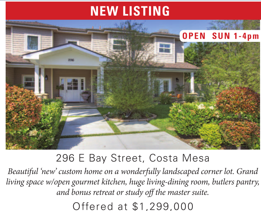 NEW LISTING OPEN SUN 1-4pm 296 E Bay Street, Costa Mesa Beautiful ‘new’ custom home on a wonderfully landscaped corner lot. Grand living space w/open gourmet kitchen, huge living-dining room, butlers pantry, and bonus retreat or study off the master suite. Offered at $1,299,000 See also