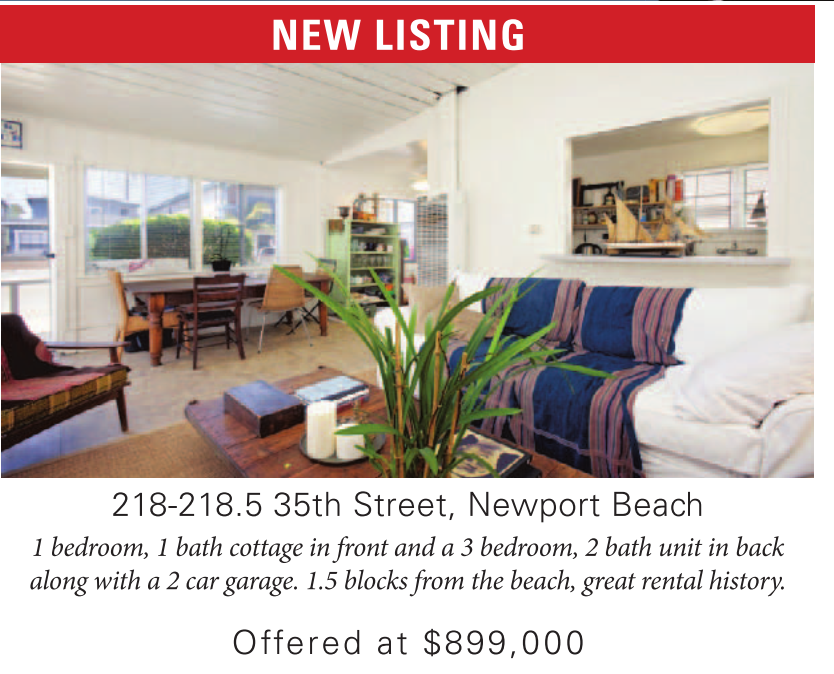 218-218.5 35th Street, Newport Beach 1 bedroom, 1 bath cottage in front and a 3 bedroom, 2 bath unit in back along with a 2 car garage. 1.5 blocks from the beach, great rental history.