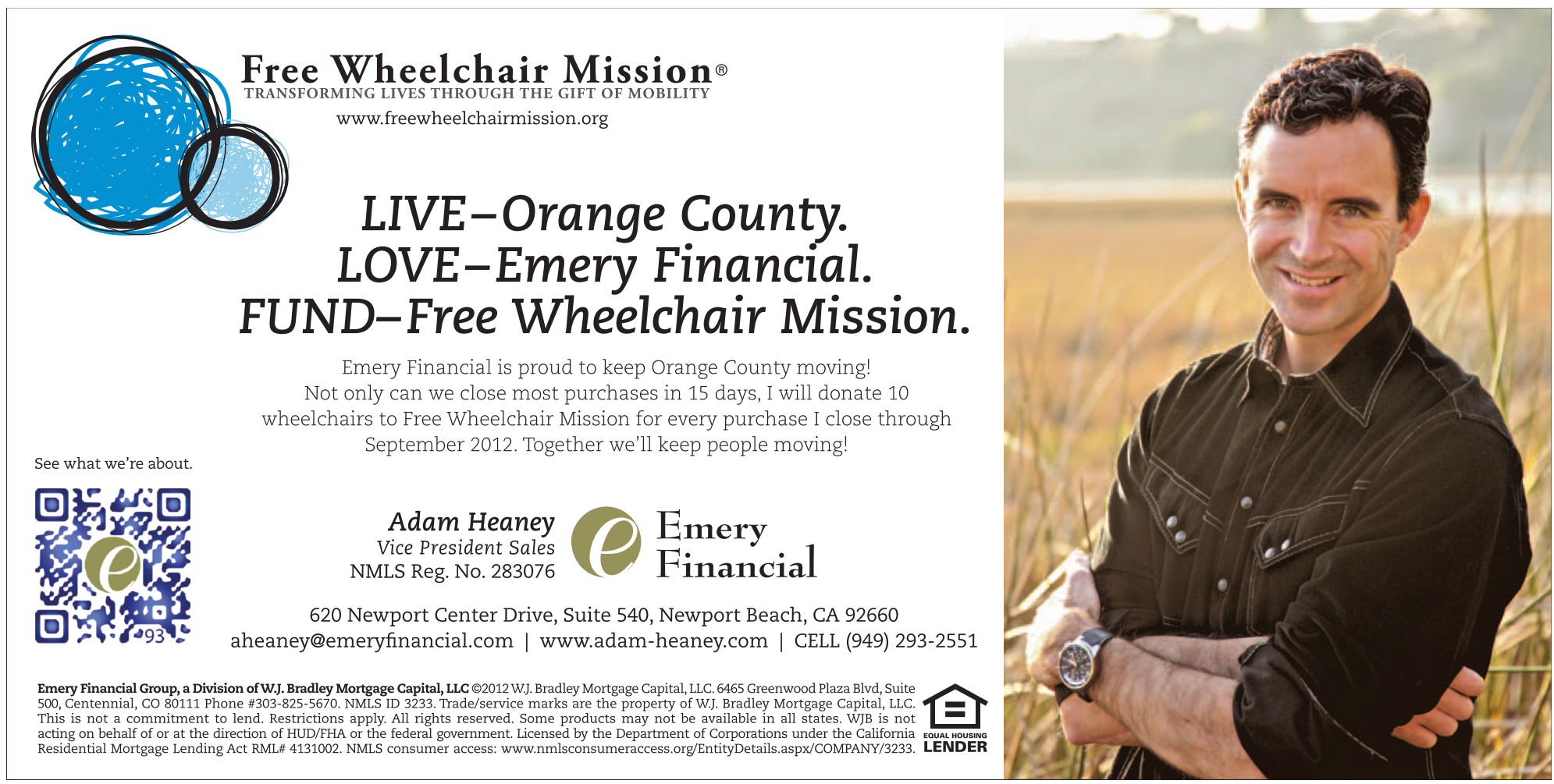 Not only can we close most purchases in 15 days, I will donate 10 wheelchairs to Free Wheelchair Mission for every purchase I close through September 2012. Together we’ll keep people moving!