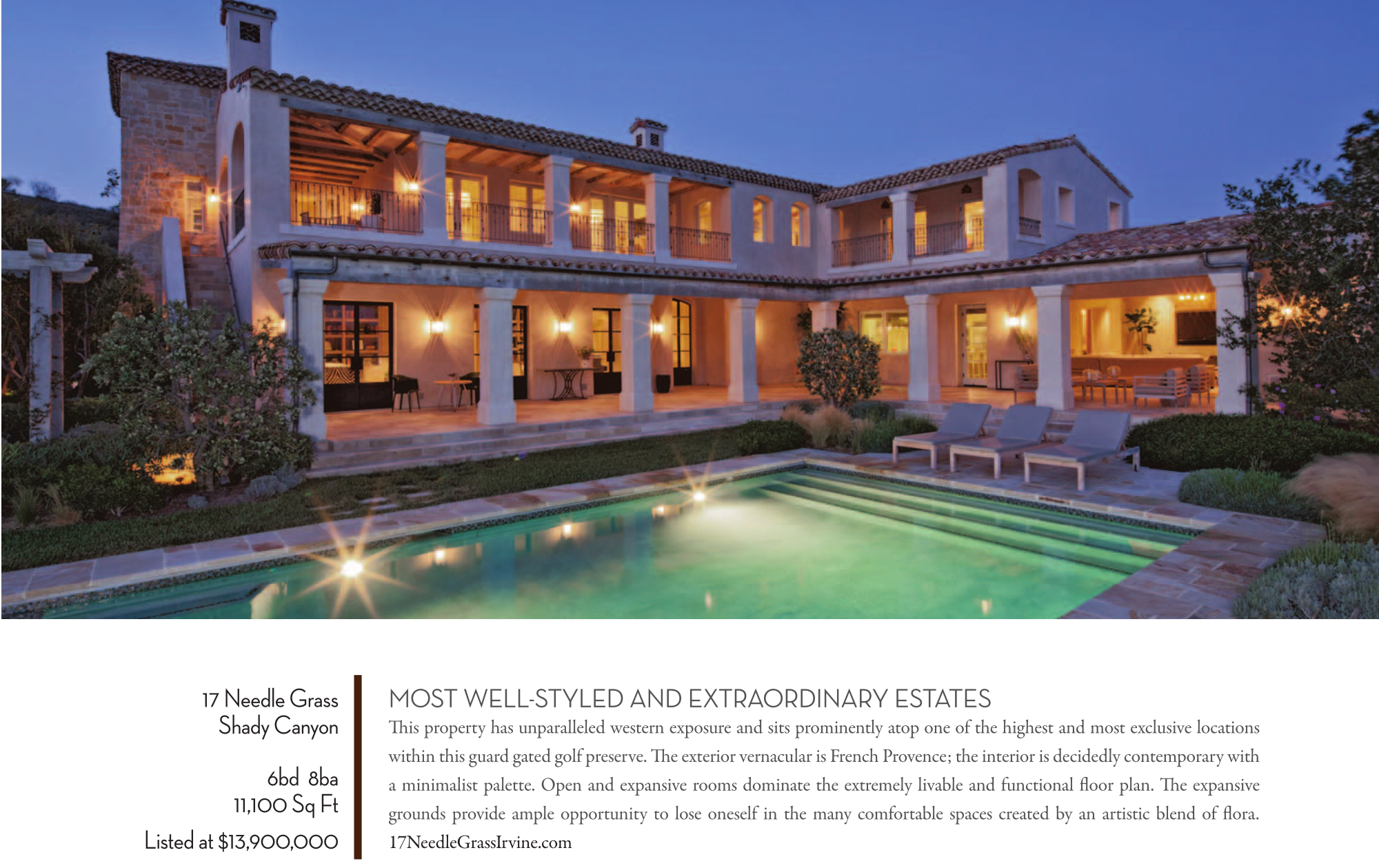 This property has unparalleled western exposure and sits prominently atop one of the highest and most exclusive locations within this guard gated golf preserve. The exterior vernacular is French Provence; the interior is decidedly contemporary with a minimalist palette. Open and expansive rooms dominate the extremely livable and functional floor plan. The expansive grounds provide ample opportunity to lose oneself in the many comfortable spaces created by an artistic blend of flora. 17NeedleGrassIrvine.com