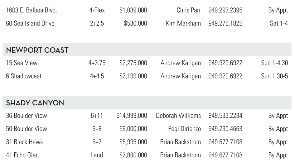 1603 E. Balboa Blvd. 4-Plex $1,089,000 Chris Parr 949.293.2395 By Appt 60 Sea Island Drive 2+2.5 $530,000 Kim Markham 949.276.1825 Sat 1-4 NEWPORT COAST 15 Sea View 4+3.75 $2,275,000 Andrew Karigan 949.929.6922 Sun 1-4:30 6 Shadowcast 4+4.5 $2,199,000 Andrew Karigan 949.929.6922 Sun 1:30-5 SHADY CANYON 36 Boulder View 6+11 $14,999,000 Deborah Williams 949.533.2234 By Appt 50 Boulder View 6+8 $6,000,000 Pegi Dirienzo 949.230.4663 By Appt 31 Black Hawk 5+7 $5,995,000 Brian Backstrom 949.677.7108 By Appt 41 Echo Glen Land $2,890,000 Brian Backstrom 949.677.7108 By Appt