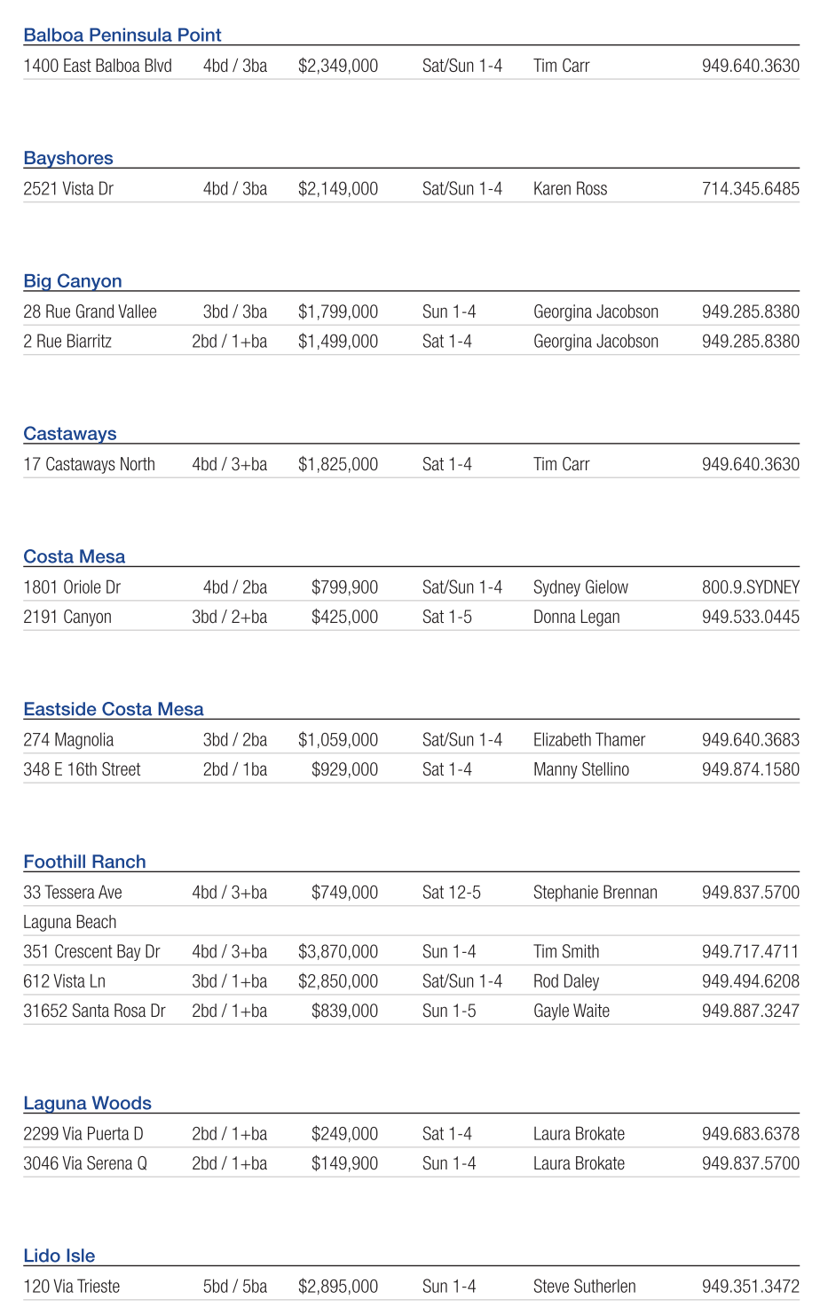 Balboa Peninsula Point 1400 East Balboa Blvd 4bd / 3ba $2,349,000 Sat/Sun 1-4 Tim Carr 949.640.3630 Bayshores 2521 Vista Dr 4bd / 3ba $2,149,000 Sat/Sun 1-4 Karen Ross 714.345.6485