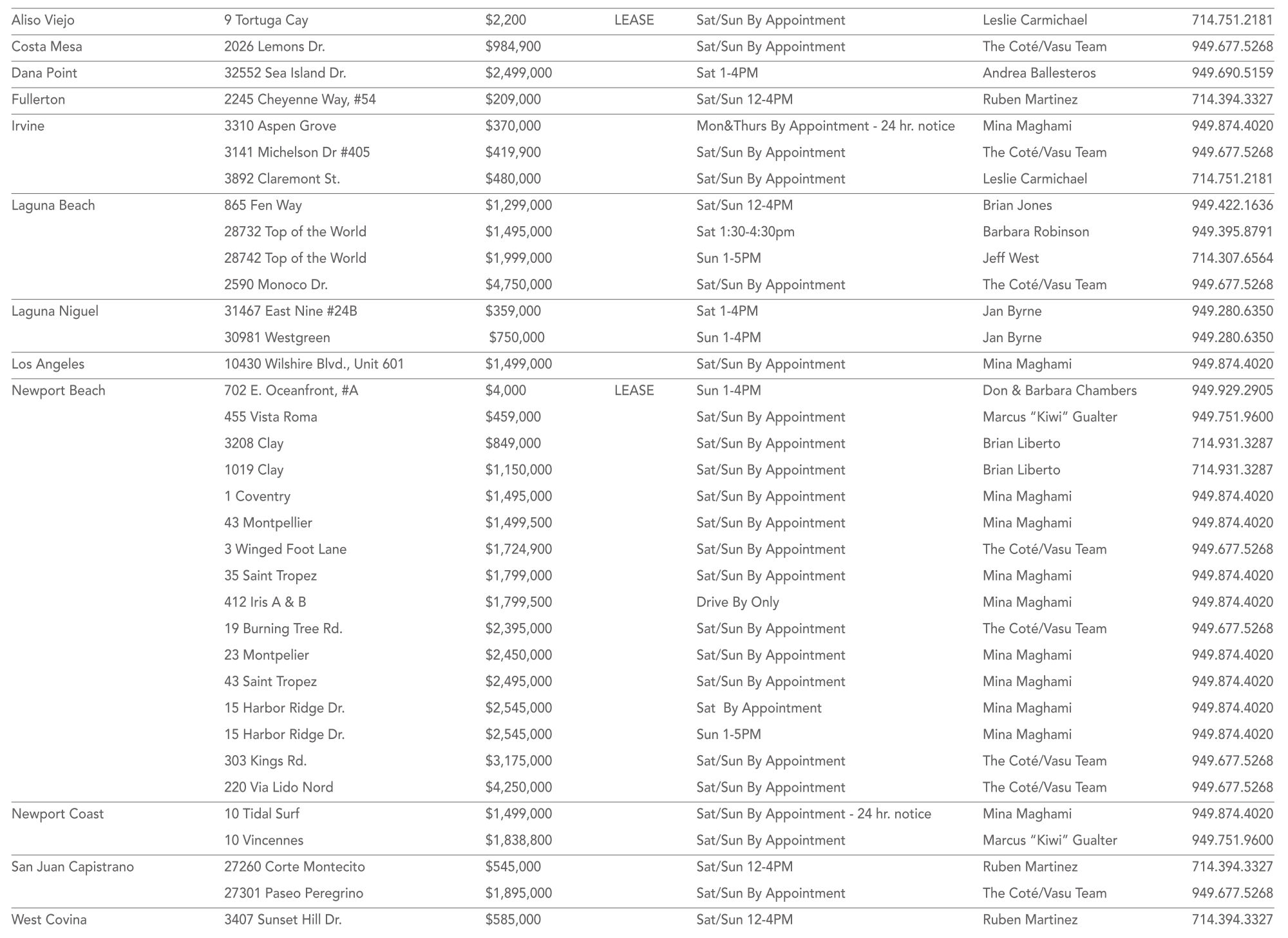 Aliso Viejo 9 Tortuga Cay $2,200 LEASE Sat/Sun By Appointment Leslie Carmichael 714.751.2181 Costa Mesa 2026 Lemons Dr. $984,900 Sat/Sun By Appointment The Coté/Vasu Team 949.677.5268 Dana Point 32552 Sea Island Dr. $2,499,000 Sat 1-4PM Andrea Ballesteros 949.690.5159 Fullerton 2245 Cheyenne Way, #54 $209,000 Sat/Sun 12-4PM Ruben Martinez 714.394.3327 Irvine 3310 Aspen Grove $370,000 Mon&Thurs By Appointment - 24 hr. notice Mina Maghami 949.874.4020 3141 Michelson Dr #405 $419,900 Sat/Sun By Appointment The Coté/Vasu Team 949.677.5268 3892 Claremont St. $480,000 Sat/Sun By Appointment Leslie Carmichael 714.751.2181 Laguna Beach 865 Fen Way $1,299,000 Sat/Sun 12-4PM Brian Jones 949.422.1636 28732 Top of the World $1,495,000 Sat 1:30-4:30pm Barbara Robinson 949.395.8791 28742 Top of the World $1,999,000 Sun 1-5PM Jeff West 714.307.6564 2590 Monoco Dr. $4,750,000 Sat/Sun By Appointment The Coté/Vasu Team 949.677.5268 Laguna Niguel 31467 East Nine #24B $359,000 Sat 1-4PM Jan Byrne 949.280.6350 30981 Westgreen $750,000 Sun 1-4PM Jan Byrne 949.280.6350 Los Angeles 10430 Wilshire Blvd., Unit 601 $1,499,000 Sat/Sun By Appointment Mina Maghami 949.874.4020 Newport Beach 702 E. Oceanfront, #A $4,000 LEASE Sun 1-4PM Don & Barbara Chambers 949.929.2905 455 Vista Roma $459,000 Sat/Sun By Appointment Marcus “Kiwi” Gualter 949.751.9600 3208 Clay $849,000 Sat/Sun By Appointment Brian Liberto 714.931.3287 1019 Clay $1,150,000 Sat/Sun By Appointment Brian Liberto 714.931.3287 1 Coventry $1,495,000 Sat/Sun By Appointment Mina Maghami 949.874.4020 43 Montpellier $1,499,500 Sat/Sun By Appointment Mina Maghami 949.874.4020 3 Winged Foot Lane $1,724,900 Sat/Sun By Appointment The Coté/Vasu Team 949.677.5268 35 Saint Tropez $1,799,000 Sat/Sun By Appointment Mina Maghami 949.874.4020 412 Iris A & B $1,799,500 Drive By Only Mina Maghami 949.874.4020 19 Burning Tree Rd. $2,395,000 Sat/Sun By Appointment The Coté/Vasu Team 949.677.5268 23 Montpelier $2,450,000 Sat/Sun By Appointment Mina Maghami 949.874.4020 43 Saint Tropez $2,495,000 Sat/Sun By Appointment Mina Maghami 949.874.4020 15 Harbor Ridge Dr. $2,545,000 Sat By Appointment Mina Maghami 949.874.4020 15 Harbor Ridge Dr. $2,545,000 Sun 1-5PM Mina Maghami 949.874.4020 303 Kings Rd. $3,175,000 Sat/Sun By Appointment The Coté/Vasu Team 949.677.5268 220 Via Lido Nord $4,250,000 Sat/Sun By Appointment The Coté/Vasu Team 949.677.5268 Newport Coast 10 Tidal Surf $1,499,000 Sat/Sun By Appointment - 24 hr. notice Mina Maghami 949.874.4020 10 Vincennes $1,838,800 Sat/Sun By Appointment Marcus “Kiwi” Gualter 949.751.9600 San Juan Capistrano 27260 Corte Montecito $545,000 Sat/Sun 12-4PM Ruben Martinez 714.394.3327 27301 Paseo Peregrino $1,895,000 Sat/Sun By Appointment The Coté/Vasu Team 949.677.5268 West Covina 3407 Sunset Hill Dr. $585,000 Sat/Sun 12-4PM Ruben Martinez 714.394.3327