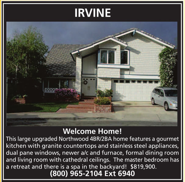 IRVINE Welcome Home! This large upgraded Northwood 4BR/2BA home features a gourmet kitchen with granite countertops and stainless steel appliances, dual pane windows, newer a/c and furnace, formal dining room and living room with cathedral ceilings. The master bedroom has a retreat and there is a spa in the backyard! $819,900. (800) 965-2104 Ext 6940 See also