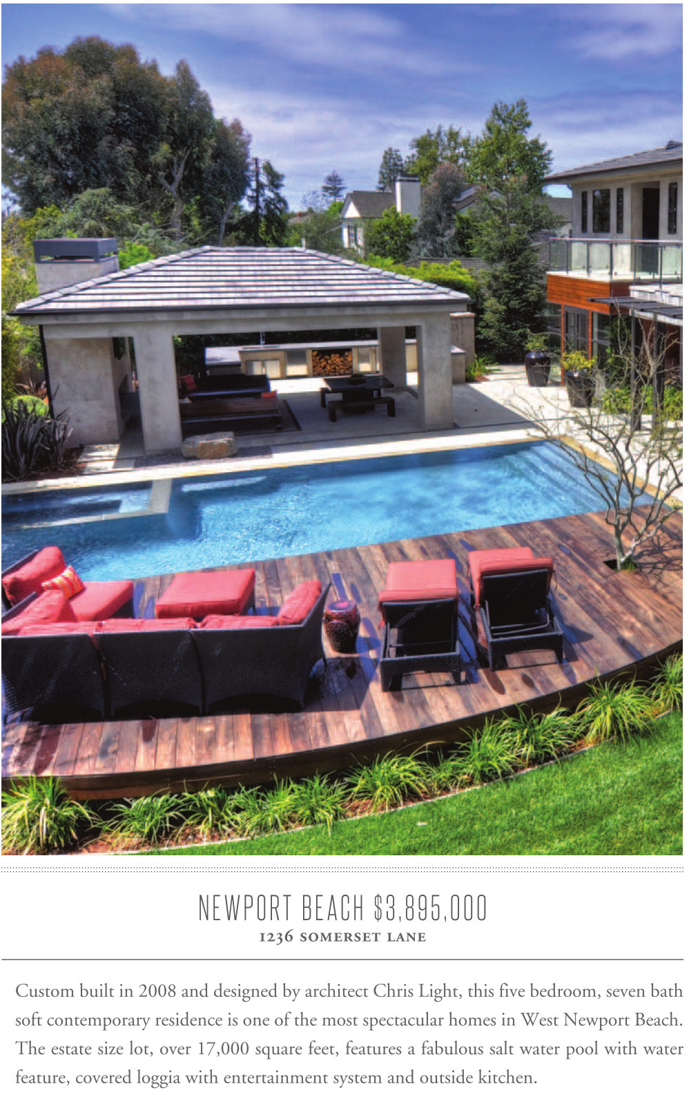 Custom built in 2008 and designed by architect Chris Light, this five bedroom, seven bath soft contemporary residence is one of the most spectacular homes in West Newport Beach. The estate size lot, over 17,000 square feet, features a fabulous salt water pool with water feature, covered loggia with entertainment system and outside kitchen.