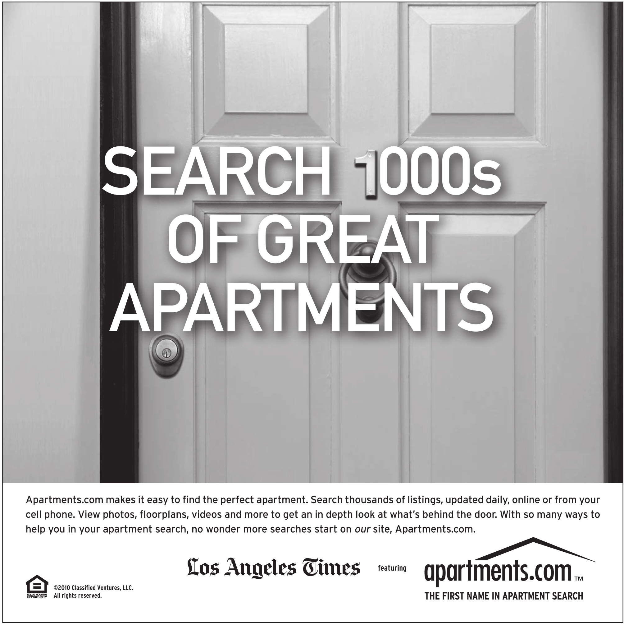 Apartments.com makes it easy to find the perfect apartment. Search thousands of listings, updated daily, online or from your cell phone. View photos, floorplans, videos and more to get an in depth look at what’s behind the door. With so many ways to help you in your apartment search, no wonder more searches start on our site, Apartments.com.