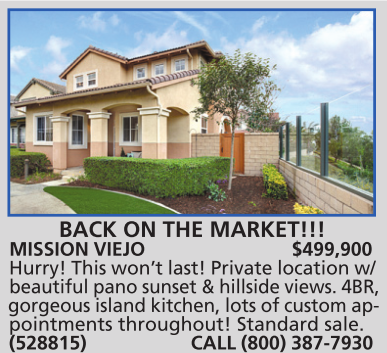MISSION VIEJO $499,900 Hurry! This won’t last! Private location w/ beautiful pano sunset & hillside views. 4BR, gorgeous island kitchen, lots of custom appointments throughout! Standard sale.