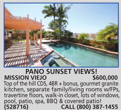 PANO SUNSET VIEWS! MISSION VIEJO $600,000 Top of the hill CDS, 4BR + bonus, gourmet granite kitchen, separate family/living rooms w/FPs, travertine floors, walk-in closet, lots of windows, pool, patio, spa, BBQ & covered patio! (528716) CALL (800) 387-1455