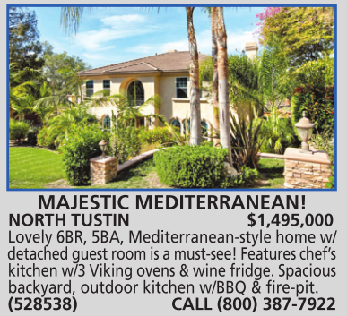 NORTH TUSTIN $1,495,000 Lovely 6BR, 5BA, Mediterranean-style home w/ detached guest room is a must-see! Features chef’s kitchen w/3 Viking ovens & wine fridge. Spacious backyard, outdoor kitchen w/BBQ & fire-pit. (528538) CALL (800) 387-7922
