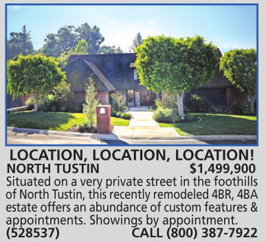 LOCATION, LOCATION, LOCATION! NORTH TUSTIN $1,499,900 Situated on a very private street in the foothills of North Tustin, this recently remodeled 4BR, 4BA estate offers an abundance of custom features & appointments. Showings by appointment. (528537) CALL (800) 387-7922