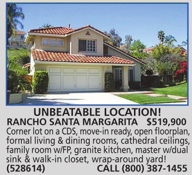 RANCHO SANTA MARGARITA $519,900 Corner lot on a CDS, move-in ready, open floorplan, formal living & dining rooms, cathedral ceilings, family room w/FP, granite kitchen, master w/dual sink & walk-in closet, wrap-around yard! (528614) CALL (800) 387-1455