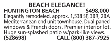 HUNTINGTON BEACH $498,000 Elegantly remodeled, approx. 1,538 SF, 3BR, 2BA Mediterranean end unit townhouse. Dual-paned windows & French doors. Premier interior lot. Huge sun-splashed patio w/park-like views. (528698) CALL (800) 387-7925