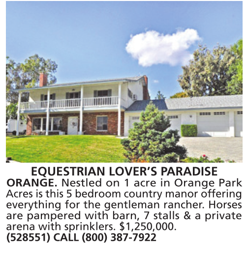 EQUESTRIAN LOVER’S PARADISE ORANGE. Nestled on 1 acre in Orange Park Acres is this 5 bedroom country manor offering everything for the gentleman rancher. Horses are pampered with barn, 7 stalls & a private arena with sprinklers. $1,250,000. (528551) CALL (800) 387-7922