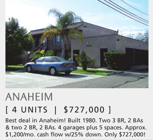 Best deal in Anaheim! Built 1980. Two 3 BR, 2 BAs & two 2 BR, 2 BAs. 4 garages plus 5 spaces. Approx. $1,200/mo. cash flow w/25% down. Only $727,000!