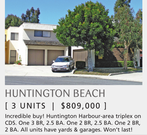 Incredible buy! Huntington Harbour-area triplex on CDS. One 3 BR, 2.5 BA. One 2 BR, 2.5 BA. One 2 BR, 2 BA. All units have yards & garages. Won’t last!