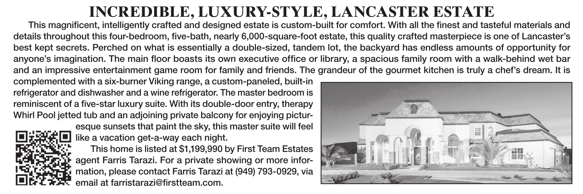 INCREDIBLE, LUXURY-STYLE, LANCASTER ESTATE This magnificent, intelligently crafted and designed estate is custom-built for comfort. With all the finest and tasteful materials and details throughout this four-bedroom, five-bath, nearly 6,000-square-foot estate, this quality crafted masterpiece is one of Lancaster’s best kept secrets. Perched on what is essentially a double-sized, tandem lot, the backyard has endless amounts of opportunity for anyone’s imagination. The main floor boasts its own executive office or library, a spacious family room with a walk-behind wet bar and an impressive entertainment game room for family and friends. The grandeur of the gourmet kitchen is truly a chef’s dream. It is complemented with a six-burner Viking range, a custom-paneled, built-in refrigerator and dishwasher and a wine refrigerator. The master bedroom is reminiscent of a five-star luxury suite. With its double-door entry, therapy Whirl Pool jetted tub and an adjoining private balcony for enjoying picturesque sunsets that paint the sky, this master suite will feel like a vacation get-a-way each night. This home is listed at $1,199,990 by First Team Estates agent Farris Tarazi. For a private showing or more information, please contact Farris Tarazi at (949) 793-0929, via email at farristarazi@firstteam.com.