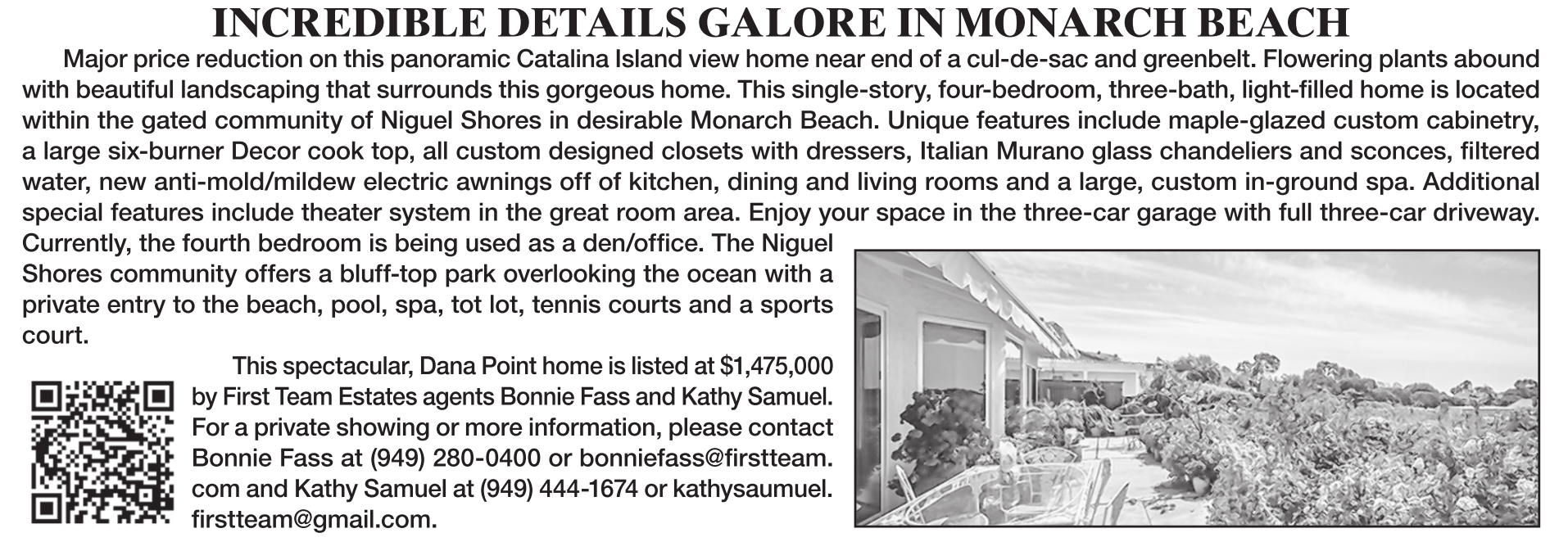 INCREDIBLE DETAILS GALORE IN MONARCH BEACH Major price reduction on this panoramic Catalina Island view home near end of a cul-de-sac and greenbelt. Flowering plants abound with beautiful landscaping that surrounds this gorgeous home. This single-story, four-bedroom, three-bath, light-filled home is located within the gated community of Niguel Shores in desirable Monarch Beach. Unique features include maple-glazed custom cabinetry, a large six-burner Decor cook top, all custom designed closets with dressers, Italian Murano glass chandeliers and sconces, filtered water, new anti-mold/mildew electric awnings off of kitchen, dining and living rooms and a large, custom in-ground spa. Additional special features include theater system in the great room area. Enjoy your space in the three-car garage with full three-car driveway. Currently, the fourth bedroom is being used as a den/office. The Niguel Shores community offers a bluff-top park overlooking the ocean with a private entry to the beach, pool, spa, tot lot, tennis courts and a sports court. This spectacular, Dana Point home is listed at $1,475,000 by First Team Estates agents Bonnie Fass and Kathy Samuel. For a private showing or more information, please contact Bonnie Fass at (949) 280-0400 or bonniefass@firstteam. com and Kathy Samuel at (949) 444-1674 or kathysaumuel. firstteam@gmail.com.
