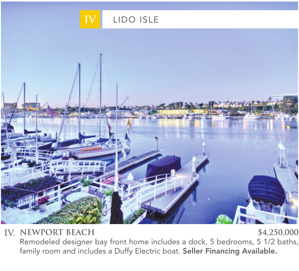IV. NEWPORT BEACH $4,250,000 Remodeled designer bay front home includes a dock, 5 bedrooms, 5 1/2 baths, family room and includes a Duffy Electric boat. Seller Financing Available.