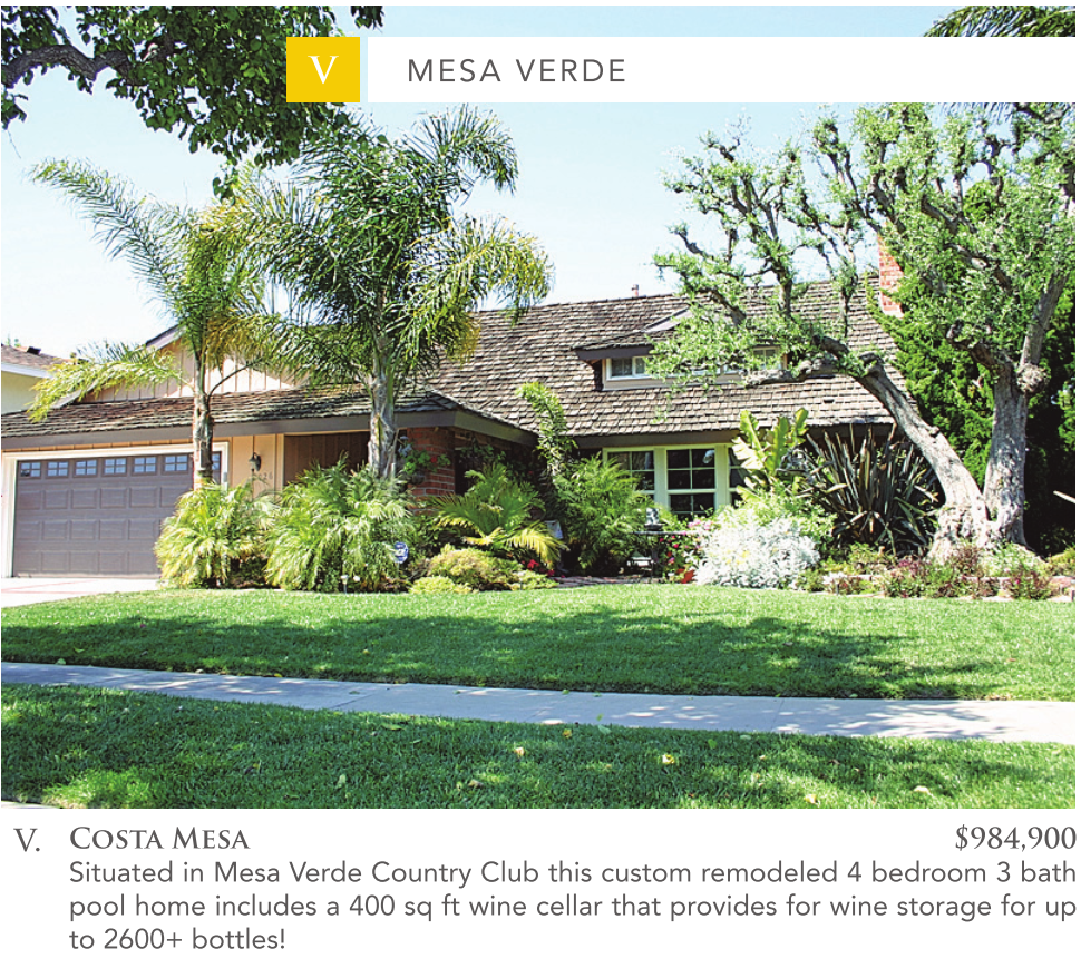 V. Costa Mesa $984,900 Situated in Mesa Verde Country Club this custom remodeled 4 bedroom 3 bath pool home includes a 400 sq ft wine cellar that provides for wine storage for up to 2600+ bottles!