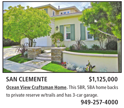 SAN CLEMENTE $1,125,000 Ocean View Craftsman Home. This 5BR, 5BA home backs to private reserve w/trails and has 3-car garage.