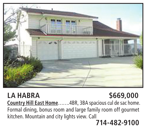 LA HABRA $669,000 Country Hill East Home…….4BR, 3BA spacious cul de sac home. Formal dining, bonus room and large family room off gourmet kitchen. Mountain and city lights view. Call 714-482-9100