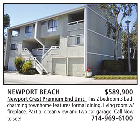 NEWPORT BEACH $589,900 Newport Crest Premium End Unit. This 2 bedroom 3 bath charming townhome features formal dining, living room w/ fireplace. Partial ocean view and two car garage. Call Now to see! 714-969-6100