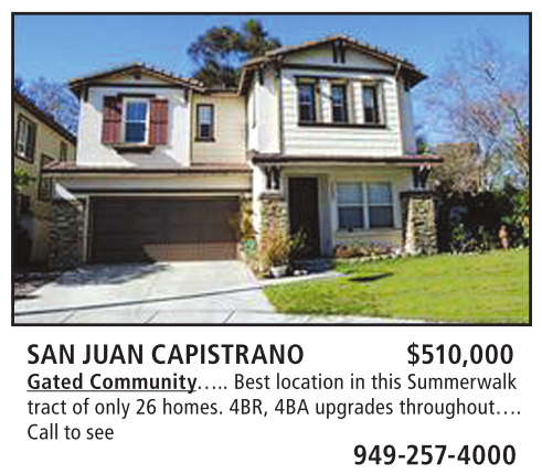 SAN JUAN CAPISTRANO $510,000 Gated Community….. Best location in this Summerwalk tract of only 26 homes. 4BR, 4BA upgrades throughout…. Call to see 949-257-4000