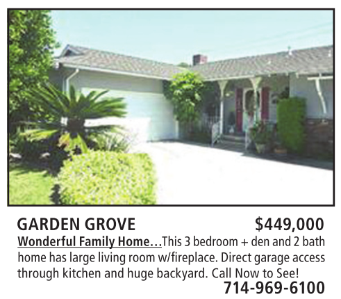 GARDEN GROVE $449,000 Wonderful Family Home…This 3 bedroom + den and 2 bath home has large living room w/fireplace. Direct garage access through kitchen and huge backyard. Call Now to See!