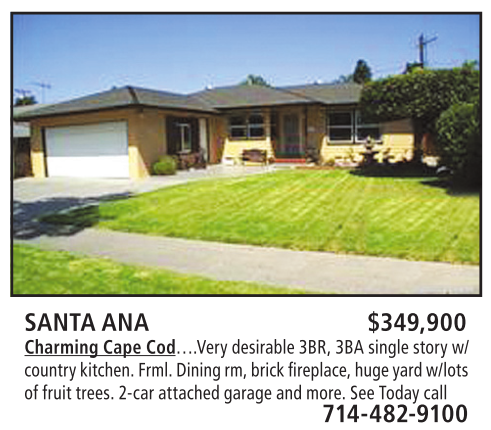 SANTA ANA $349,900 Charming Cape Cod….Very desirable 3BR, 3BA single story w/ country kitchen. Frml. Dining rm, brick fireplace, huge yard w/lots of fruit trees. 2-car attached garage and more. See Today call 714-482-9100