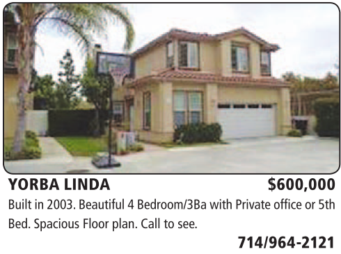 YORBA LINDA $600,000 Built in 2003. Beautiful 4 Bedroom/3Ba with Private office or 5th Bed. Spacious Floor plan. Call to see.