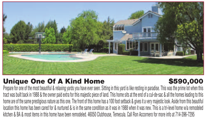 Unique One Of A Kind Home $590,000 Prepare for one of the most beautiful & relaxing yards you have ever seen. Sitting in this yard is like resting in paradise. This was the prime lot when this tract was built back in 1988 & the owner paid extra for this majestic piece of land. This home sits at the end of a cul-de-sac & all the homes leading to this home are of the same prestigious nature as this one. The front of this home has a 100 foot setback & gives it a very majestic look. Aside from this beautiful location this home has been cared for & nurtured & is in the same condition as it was in 1988 when it was new. This is a tri-level home w/a remodeled kitchen & BA & most items in this home have been remodeled. 46050 Clubhouse, Temecula. Call Ron Accornero for more info at 714-396-7295