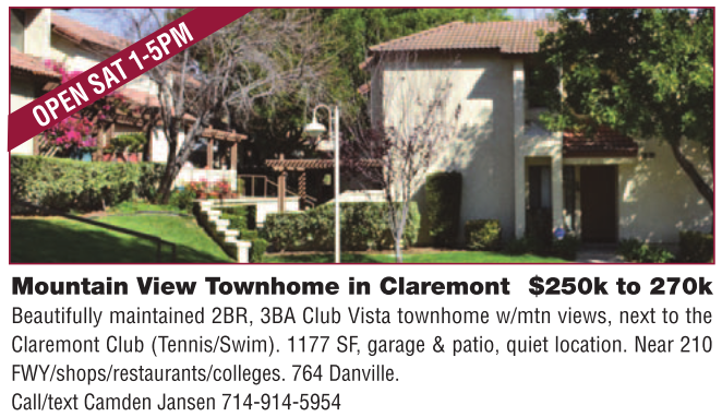Mountain View Townhome in Claremont $250k to 270k Beautifully maintained 2BR, 3BA Club Vista townhome w/mtn views, next to the Claremont Club (Tennis/Swim). 1177 SF, garage & patio, quiet location. Near 210 FWY/shops/restaurants/colleges. 764 Danville. Call/text Camden Jansen 714-914-5954